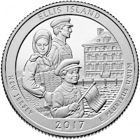 Here we see a similar-but-different problem to the South Carolina Fort-Moutraine-but-not-Fort-Sumpter quarter of last year. We have Ellis Island which is (mostly) part of Jersey (and has been since a 1998 court case), but what attracts everyone's attention is Liberty Island and the large green lady there (No, I am not talking about She-Hulk). On one hand, the entire complex is Federal property (so it really doesn't matter WHO owns WHAT on the island), but on the other, New Jersey DID claim this for their quarter.