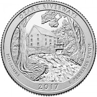 Anyway, the the Ozark Scenic National Riverway is a tetris-block assembly of territory along the Current River and the Jacks Fork. It apparently has great canoeing and tubing, along with a number of natural springs. The coin shows Alley Mill, which used steel rollers to grind grain and is still mostly intact. And it is really not that bad, what with the tree framing the mill and the water (which doesn't look wide enough to qualify as a canoeable river, so let's call it a tributary), dominating the center.